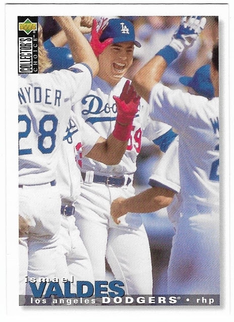 like i mentioned above, i bought a lot, and i mean a lot, of collector's choice in 1995. both this and the blue bordered "se" release. i also bought a lot of topps and upper deck flagship. hideo nomo was the big rookie to chase as far as i was concerned, but none of his cards that i was able to find that year lived up to the hype. instead, i was most enamored with raul mondesi's flagship topps card (which sits in my favorite dodger of the year mini collection) and this collector's choice ismael valdes card.mondesi is on the valdes card among the horde of dodgers - he's the guy with the red wristbands and batting gloves. others making an appearance are cory snyder, tommy lasorda, and tim wallach. valdes is so happy, and there is just the right amount of dodger red, white, and blue on the card that it rose to the top of the class as far as dodger cards i obtained in 1995.
