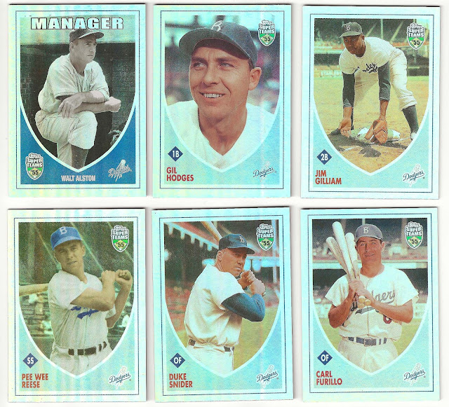 in my most recent trade with sluggo, i received nearly the entire dodger team set in retrofractor form. these cards are numbered to the season represented, so in the dodgers' case that means 1955