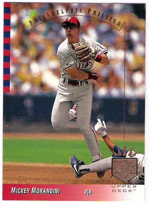 while mickey morandini's card hits three of my mini-collectionsdouble play, dodger stadium, and dodger lurker - brett butler is sliding in.