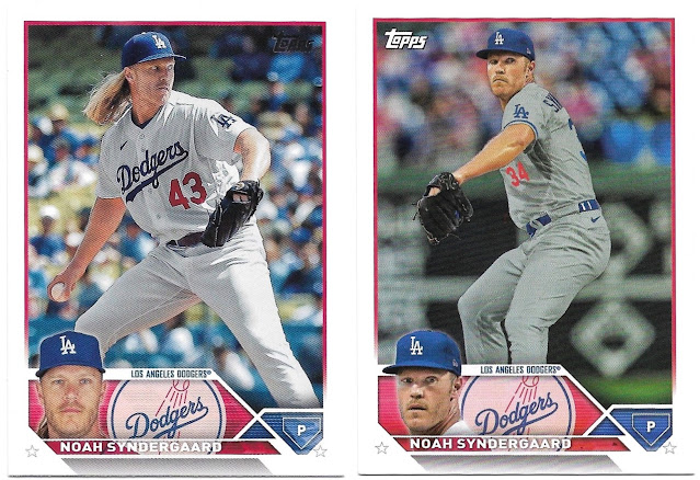 ok here we are. syndergaard got a dodger card in update that uses a real photo of him as a dodger. two photos, actually. it is a vast improvement over the photoshopped team set card that showed him wearing fernando valenzuela's number 34. big difference between these two cards!